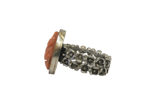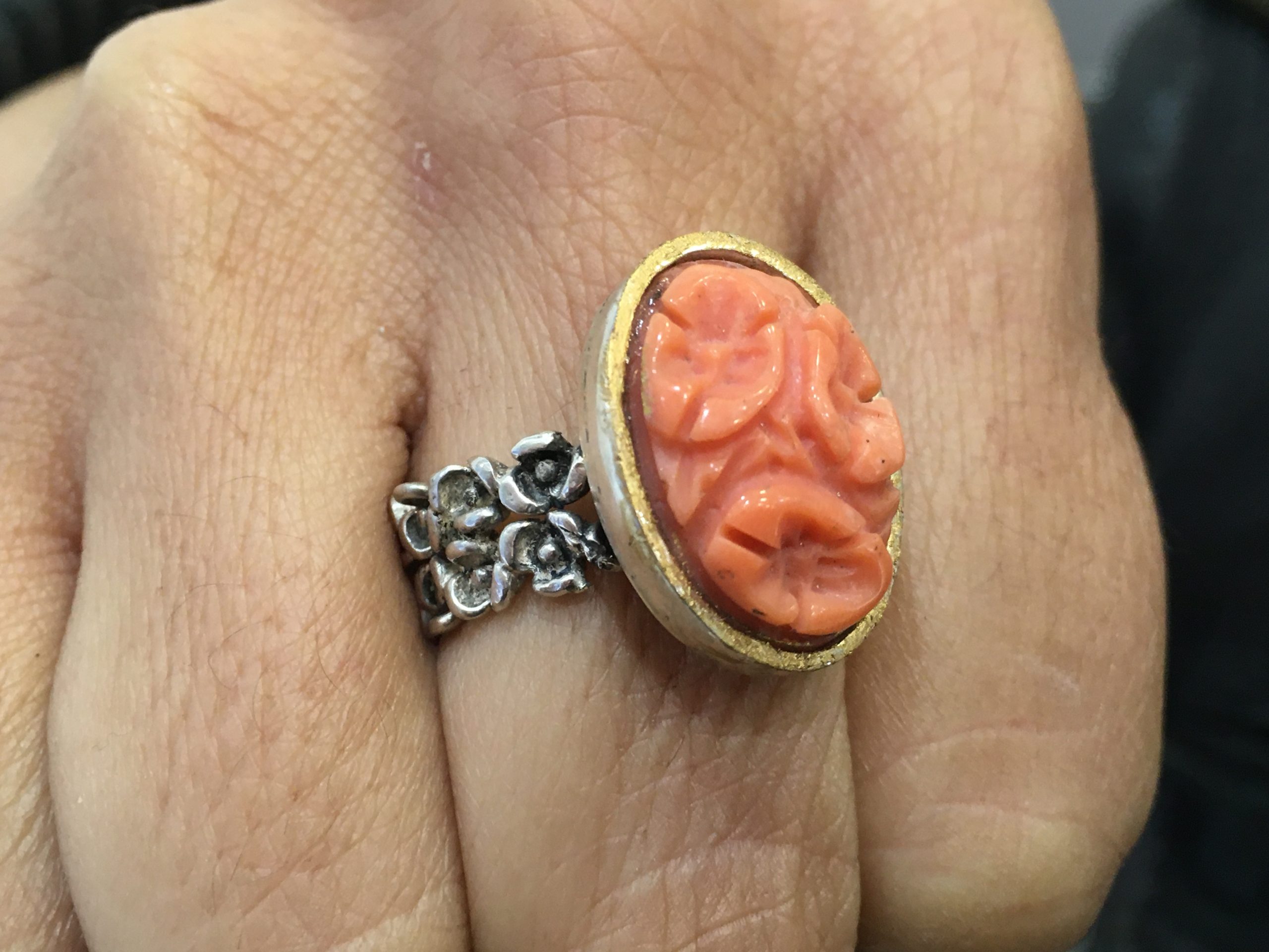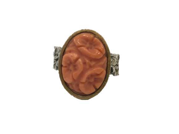 Anillo plata y dorado con coral tallado.