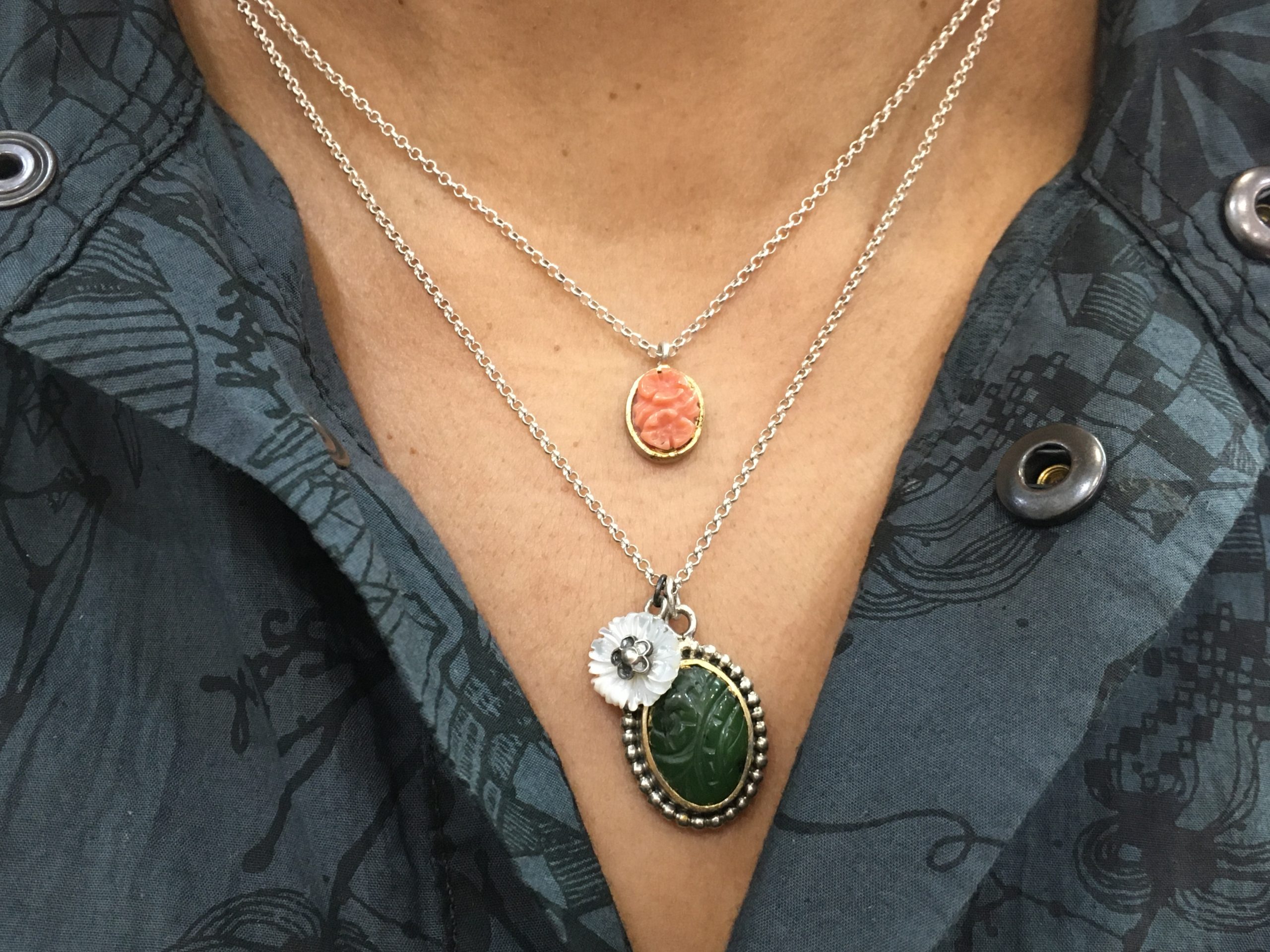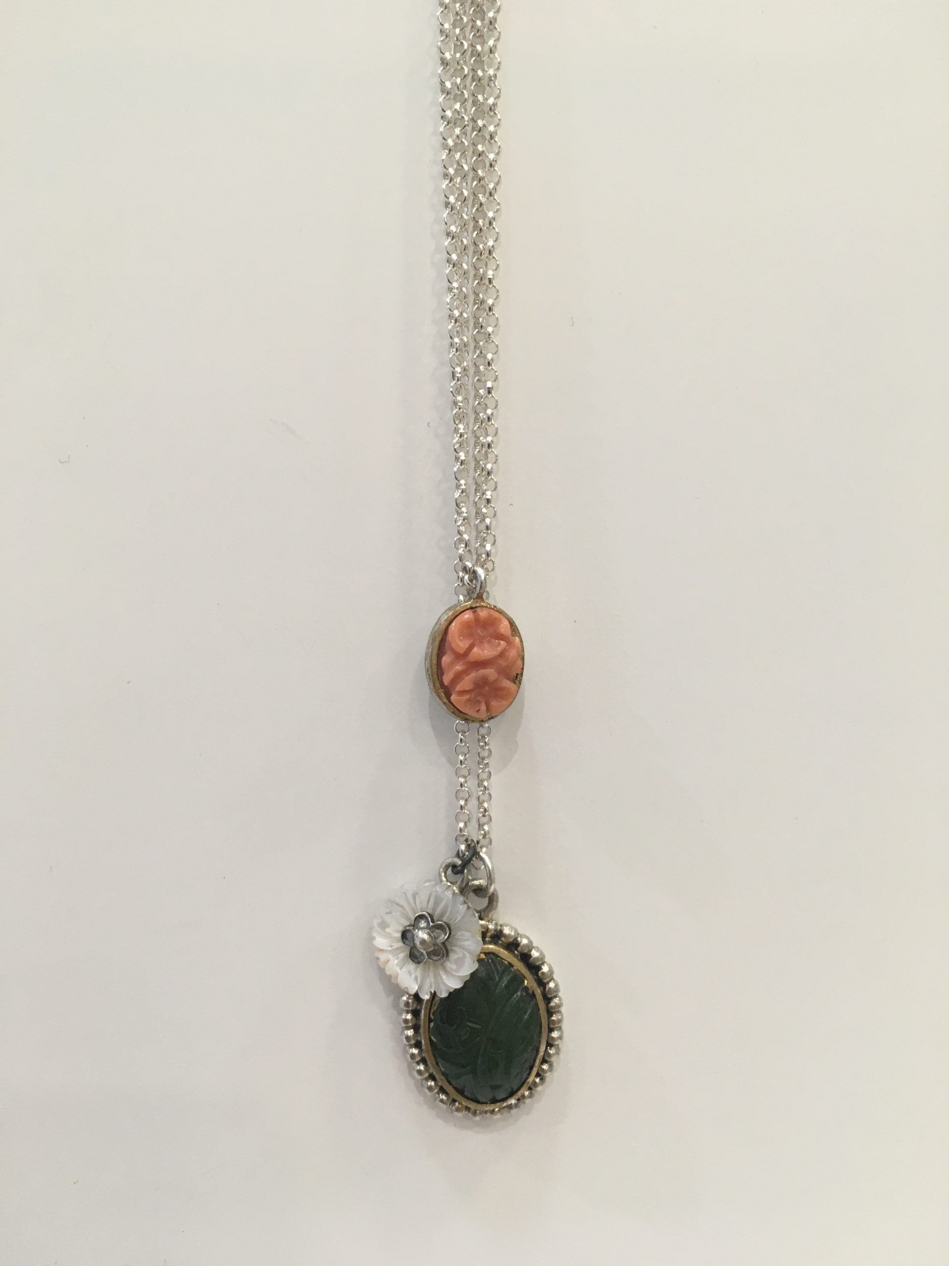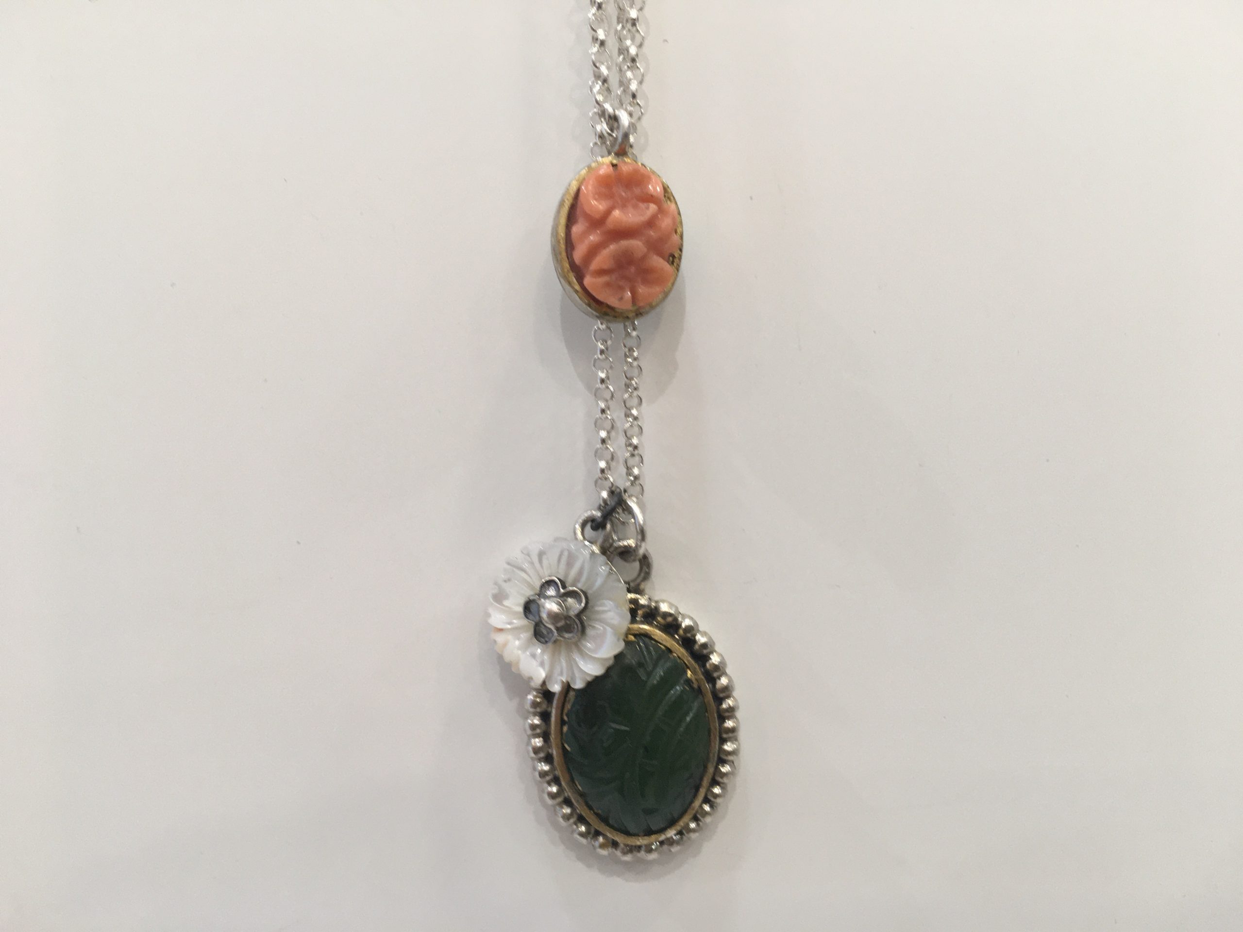 Colgante plata dorado, jade tallado, nácar flor y coral floral