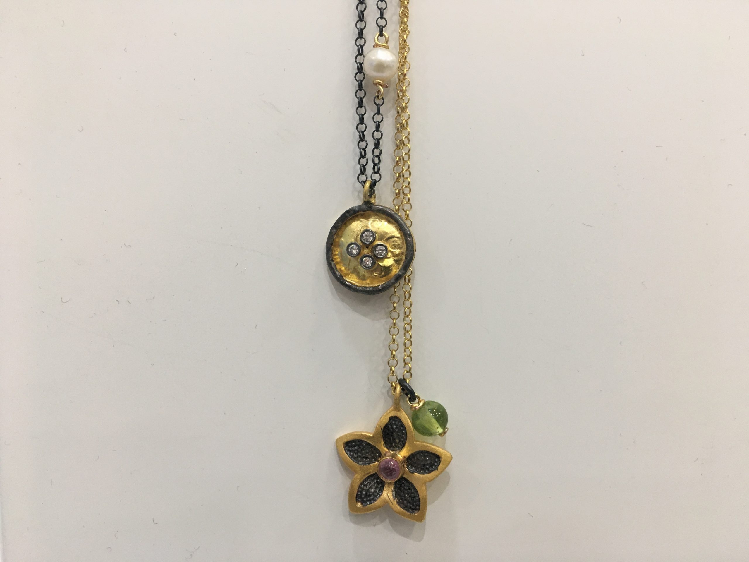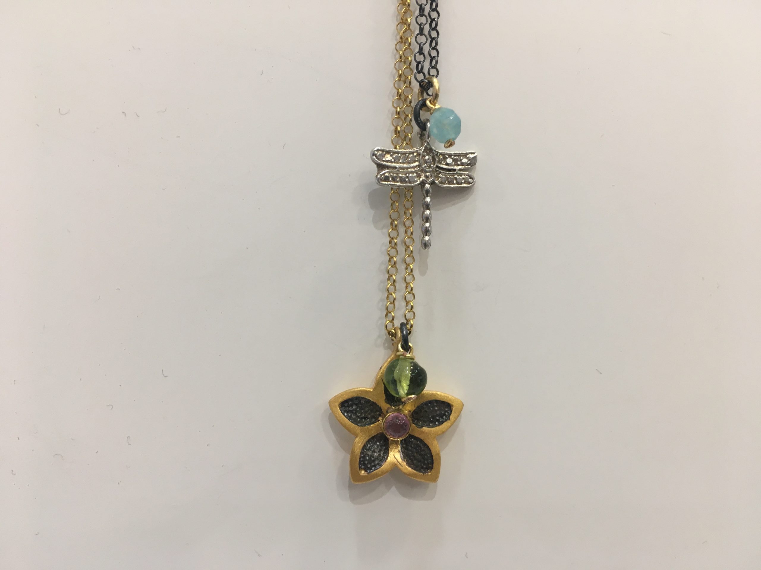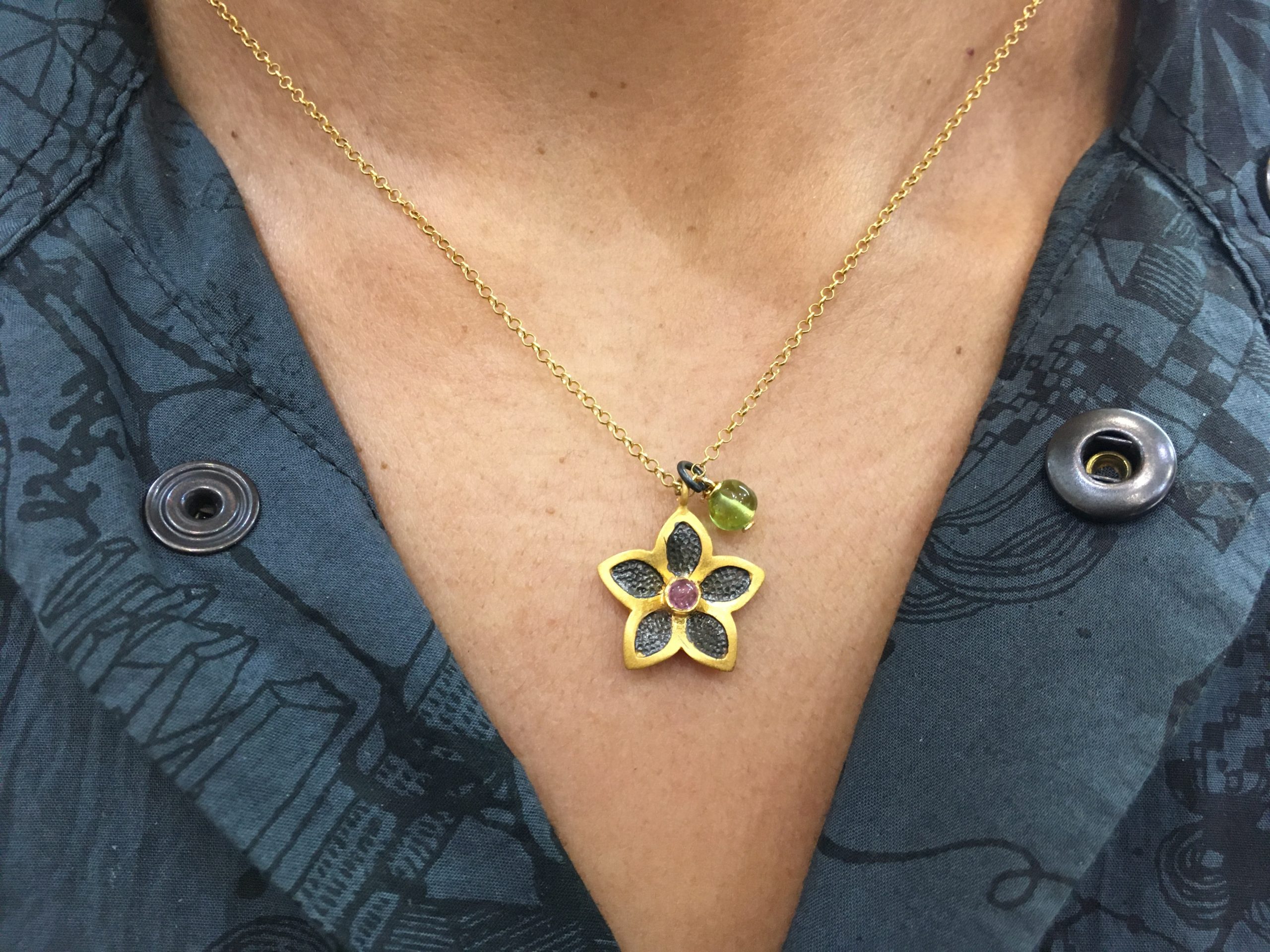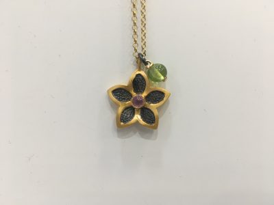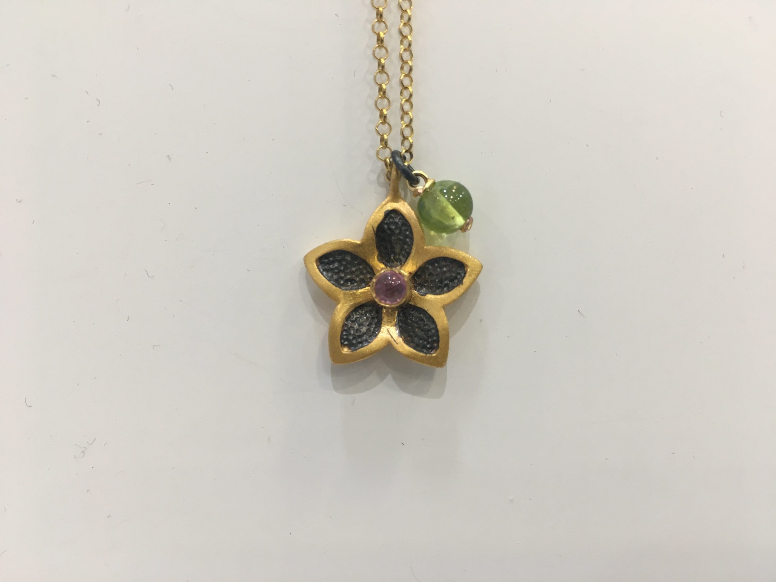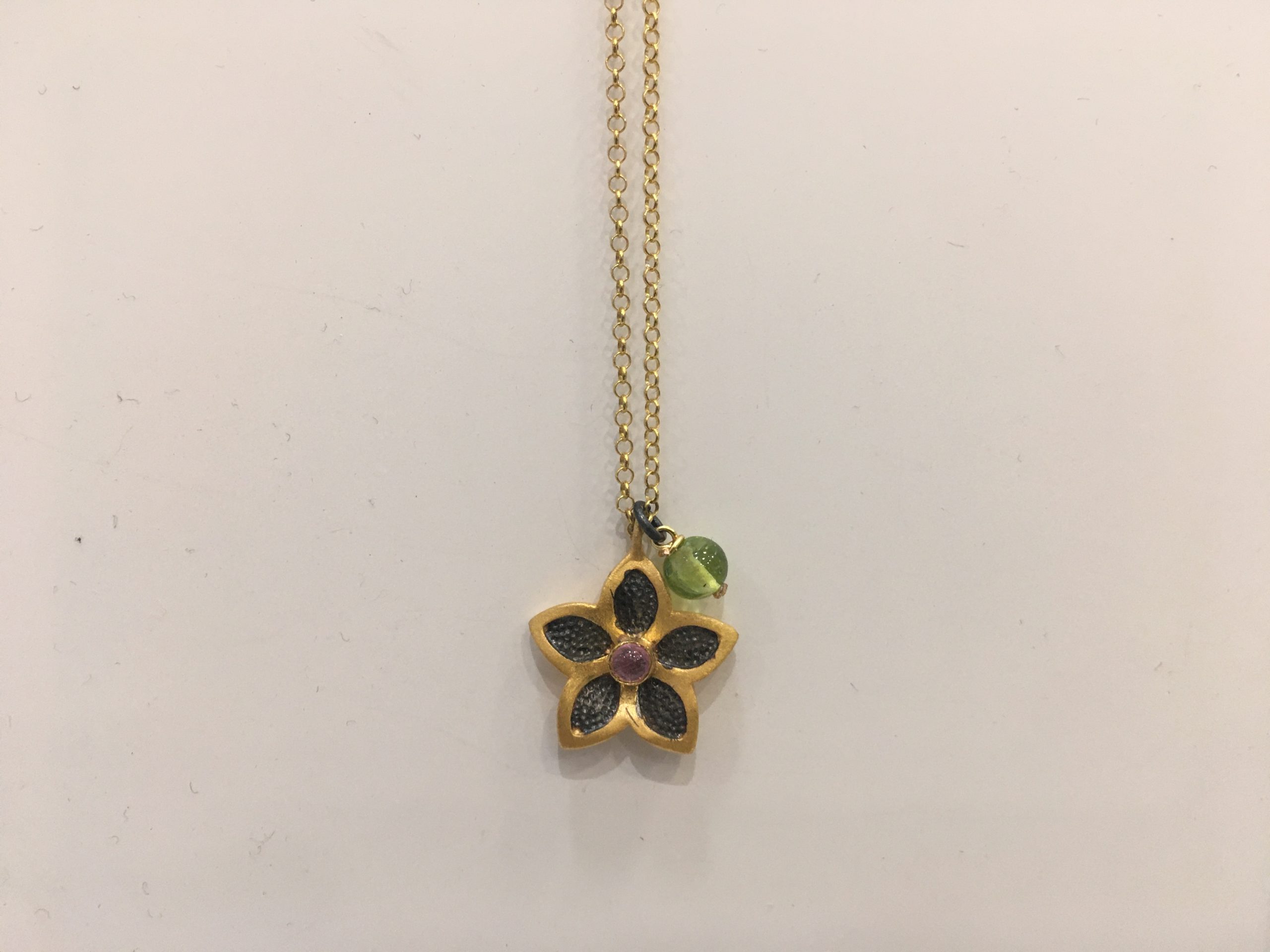 Colgante flor en plata dorada y negra con turmalina rosa y cadena dorada en plata dorada con bola peridoto.