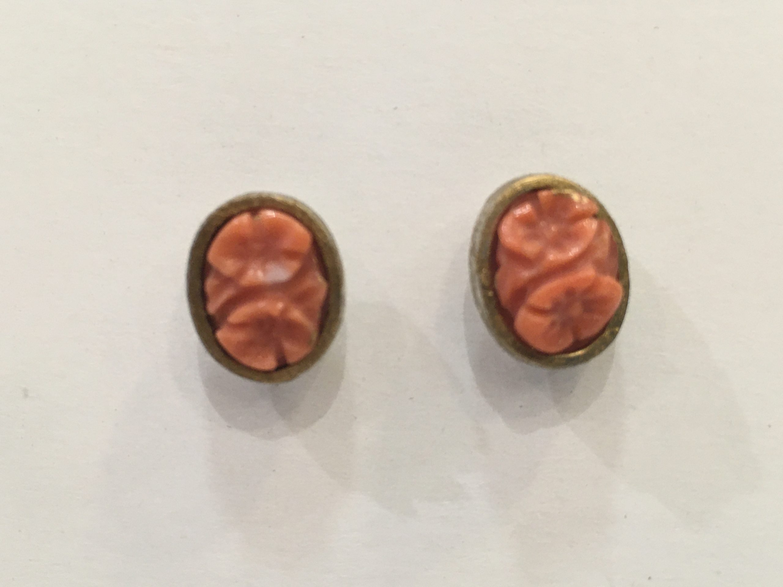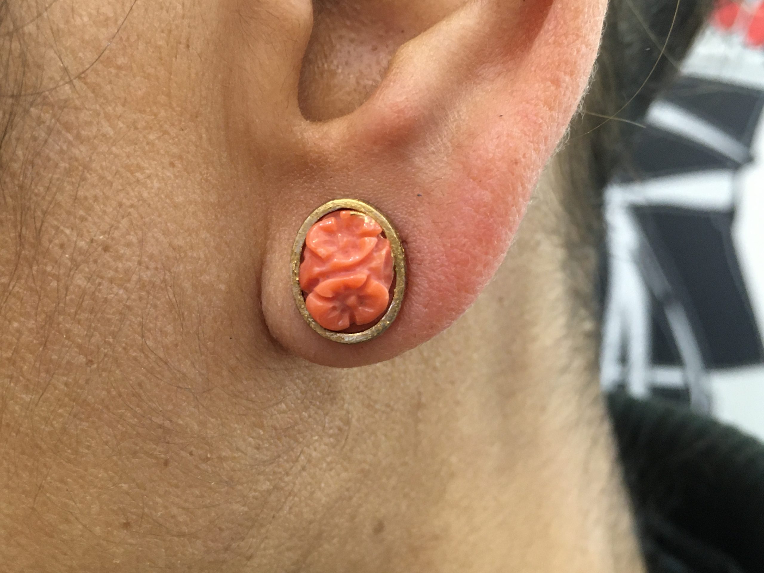 Pendientes plata y dorado con coral tallado.